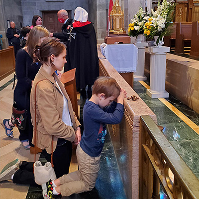 The innocence and purity of St. Bernadette was reflected in a little boy who venerated the relic, and then went to kneel at the communion rail, placing his rosary next to his folded hands. It seemed as if he were drawn into the beauty of St. Bernadette, focused on something or someone who was beyond the range of vision.