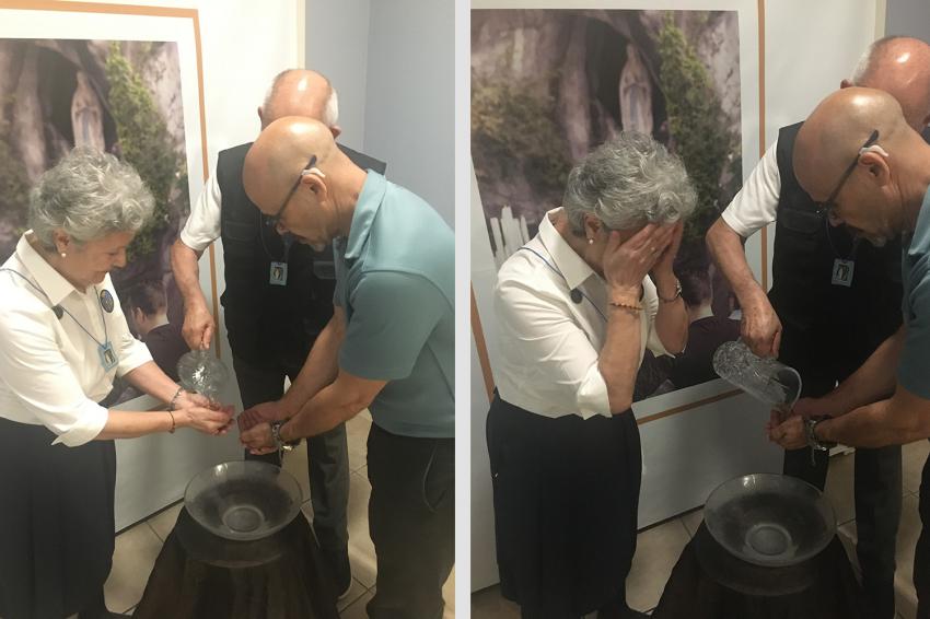 Bernadette took her relationship with Mary very seriously and we are here, enveloped by the embrace of Bernadette, in cooperation with the Virgin. As we do the Gesture of the Water, pray for healing of the mind, body, and spirit.”